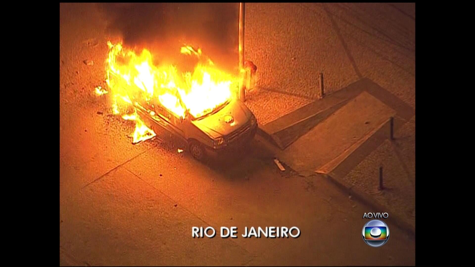 Carro do SBT incendiado em manifestações.